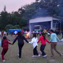 キャンプファイヤーでは、ダンスなど楽しんでいます。暗くなってきました。 ...