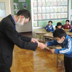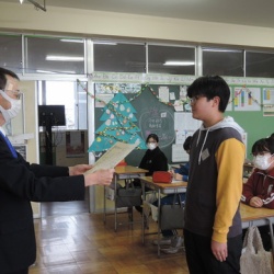 2学期に各分野で活躍した子たちへ賞状を伝達しました。当初は、全校児童の揃ったところで行う予定でしたが、体調不良者が多くなってしまったため、校長が各学級を回って伝達しています。今日は、5・6年生の教室を訪問しました。ポスターや絵はがき、絵画、読書感想文な ...