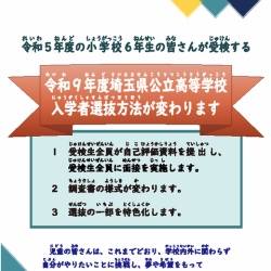 埼玉県内の公立学校で昨日から入試が始まりました。みなさん頑張ってくださいね。 小学校も無関係ではありません。現在の6年生が受検する令和9年度埼玉県公立高等学校入学者選抜方法が変わります、と埼玉県教育委員会からお知らせがありました。 ・受検生全員が自己評 ...