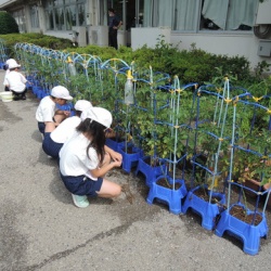 朝は曇っていましたが、次第に晴れ、暑い日となりました。 2年生が鉢や畑で育てている野菜が大きく育っています。ミニトマト、キュウリ、ピーマンなどを収穫することができました。 ...