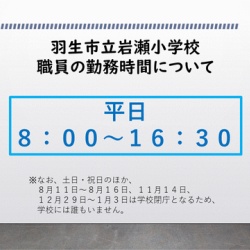 既にお知らせしたとおり、埼玉県教育委員会及び羽生市教育委員会の要請により、教員の働き方改革の一環として、本校では来週9月15日から21日までを「定時退勤ウイーク」と設定しました。退勤時刻に施錠するため、16時30分以降は誰もいません。緊急の場合は、110番及び119番 ...